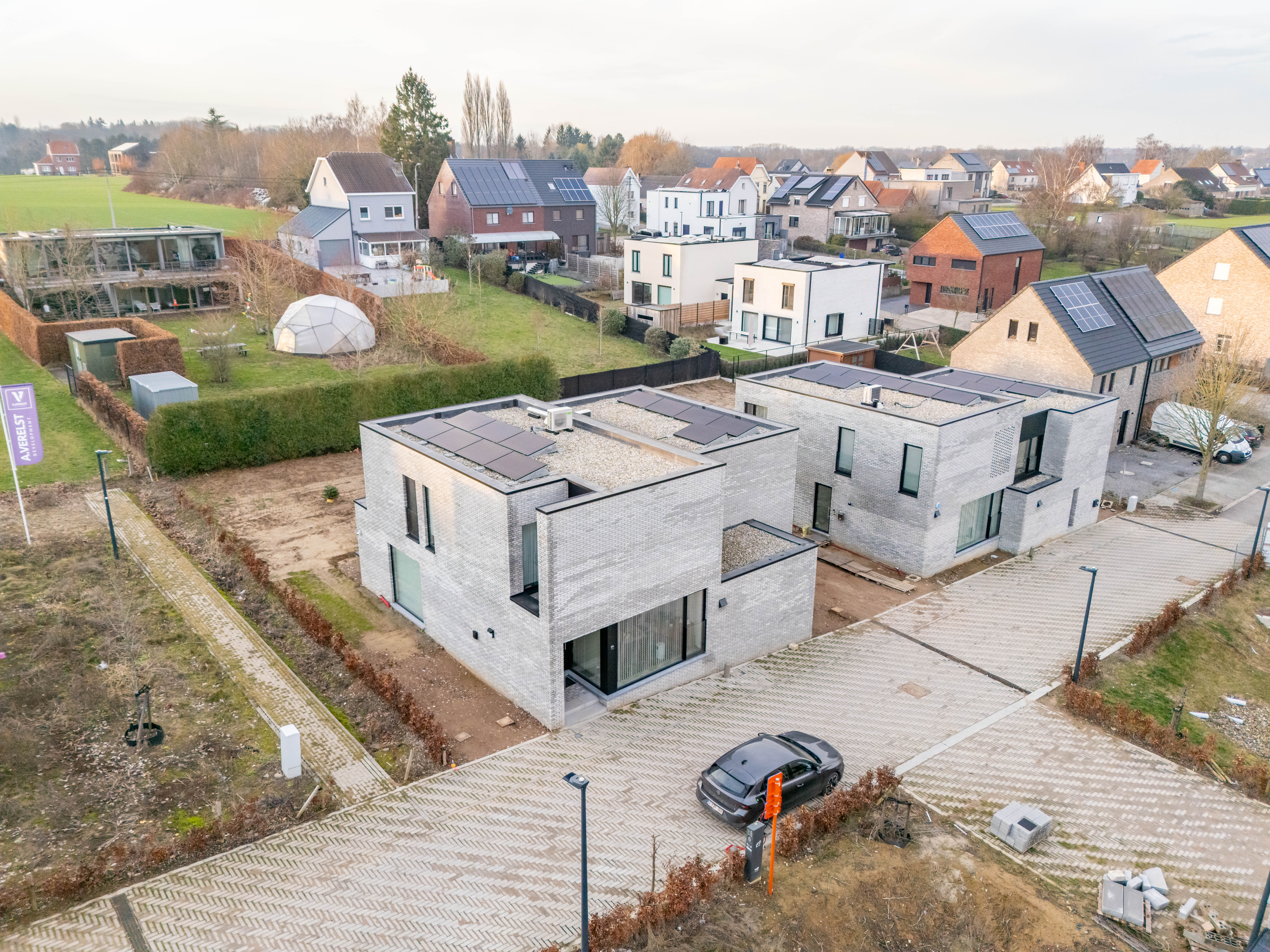Voor het ontwerpen van de woningen zelf werd er voor éénzelfde architectuur geopteerd: een eenvoudige, strakke en moderne architectuurtaal waarbij de hoogteverschillen, het schakelen van de volumes en de aansluiting op de publieke open ruimte een extra accent leggen op de inrichting en de beleving van de individuele woningen, de collectieve ruimte en het gehele woonerf.