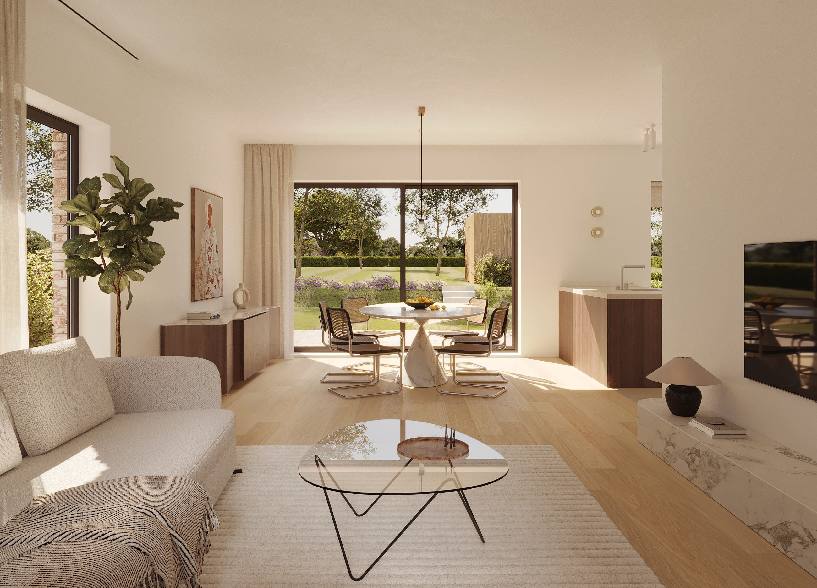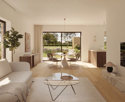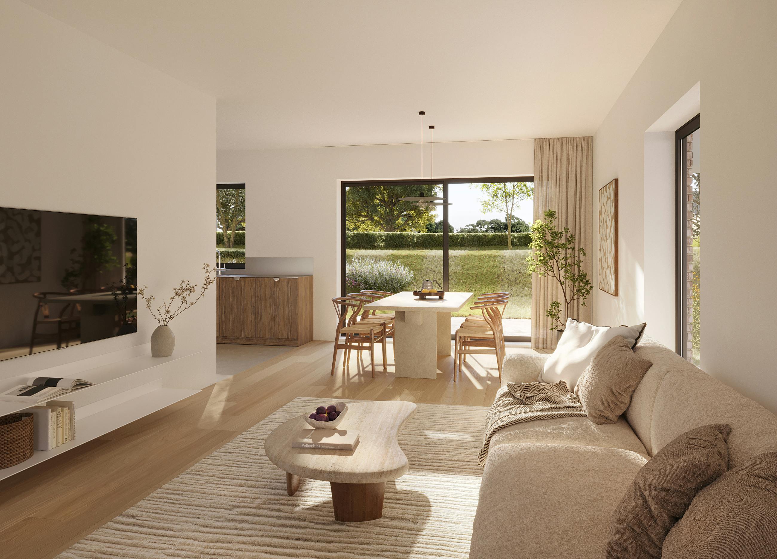 De grote raampartijen aan de leefruimte geven uit op het volledig groene zicht achter uw tuin.